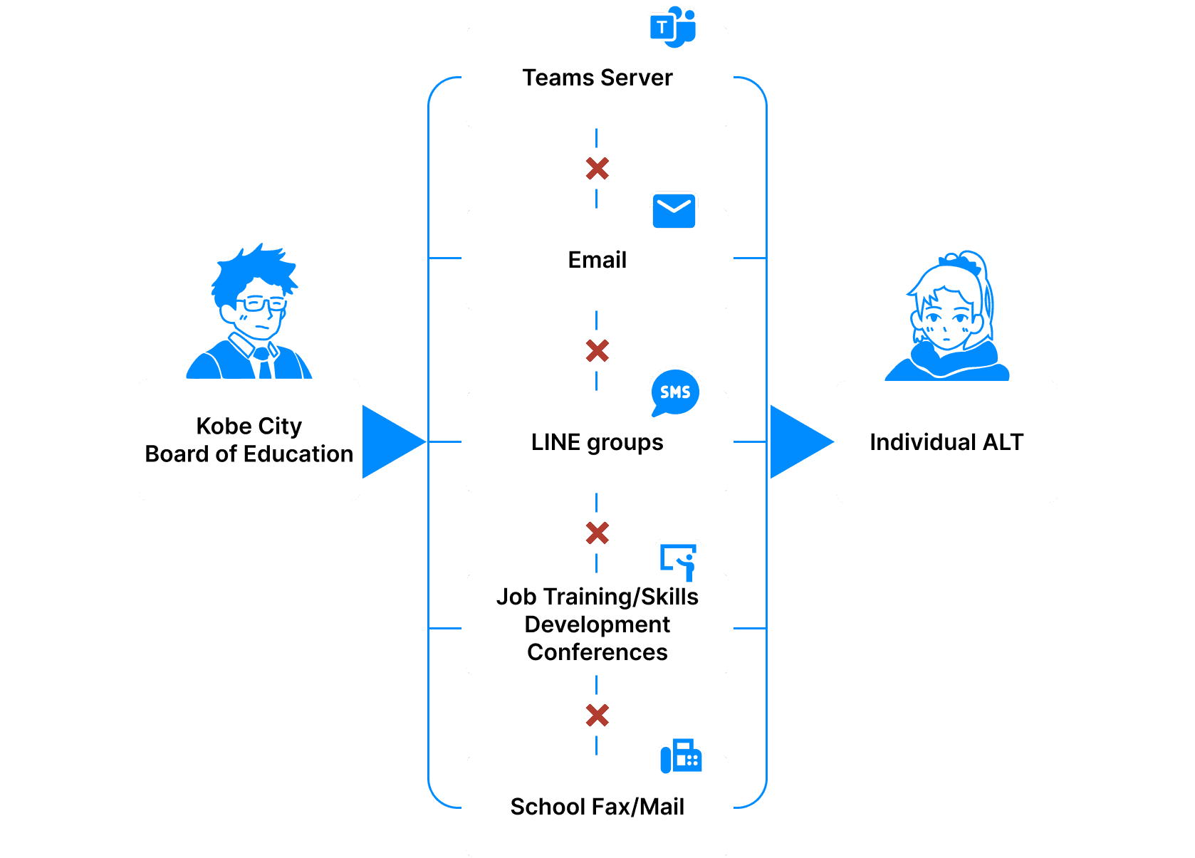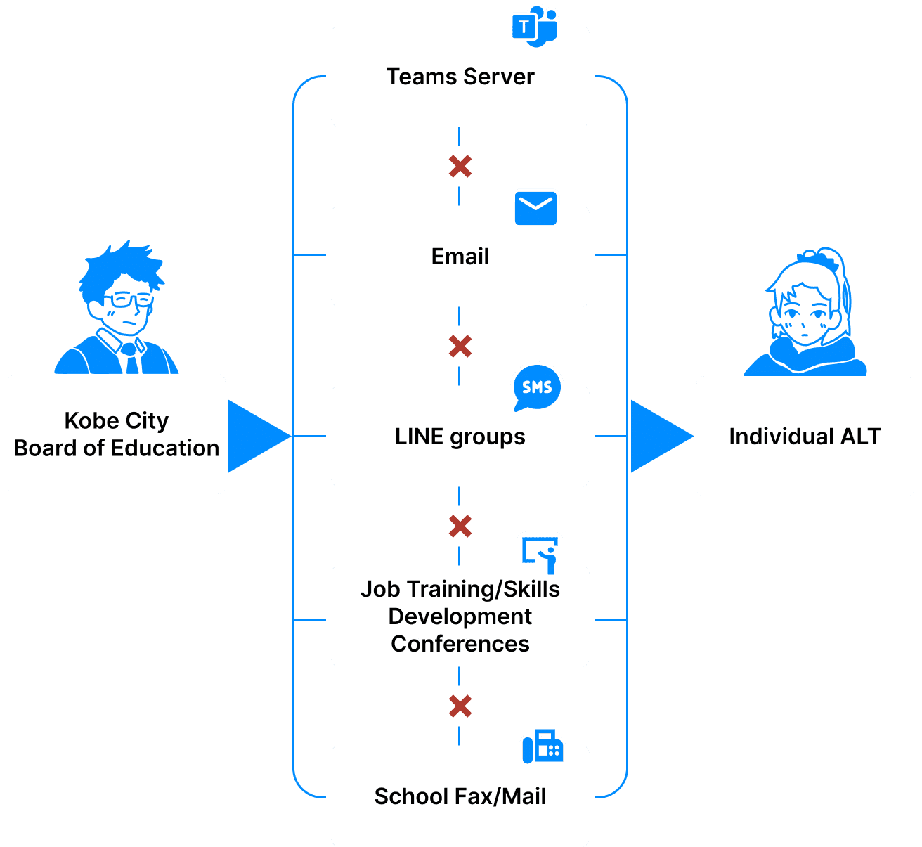 The current communication flow between the Board of Education (BOE), CIRs, and ALTs is a fragmented, multi-step process involving emails, LINE groups, Teams files, and PDFs with no central ownership. across multiple disconnected tools. Each platform functions in isolation, forcing ALTs to check multiple channels for updates.