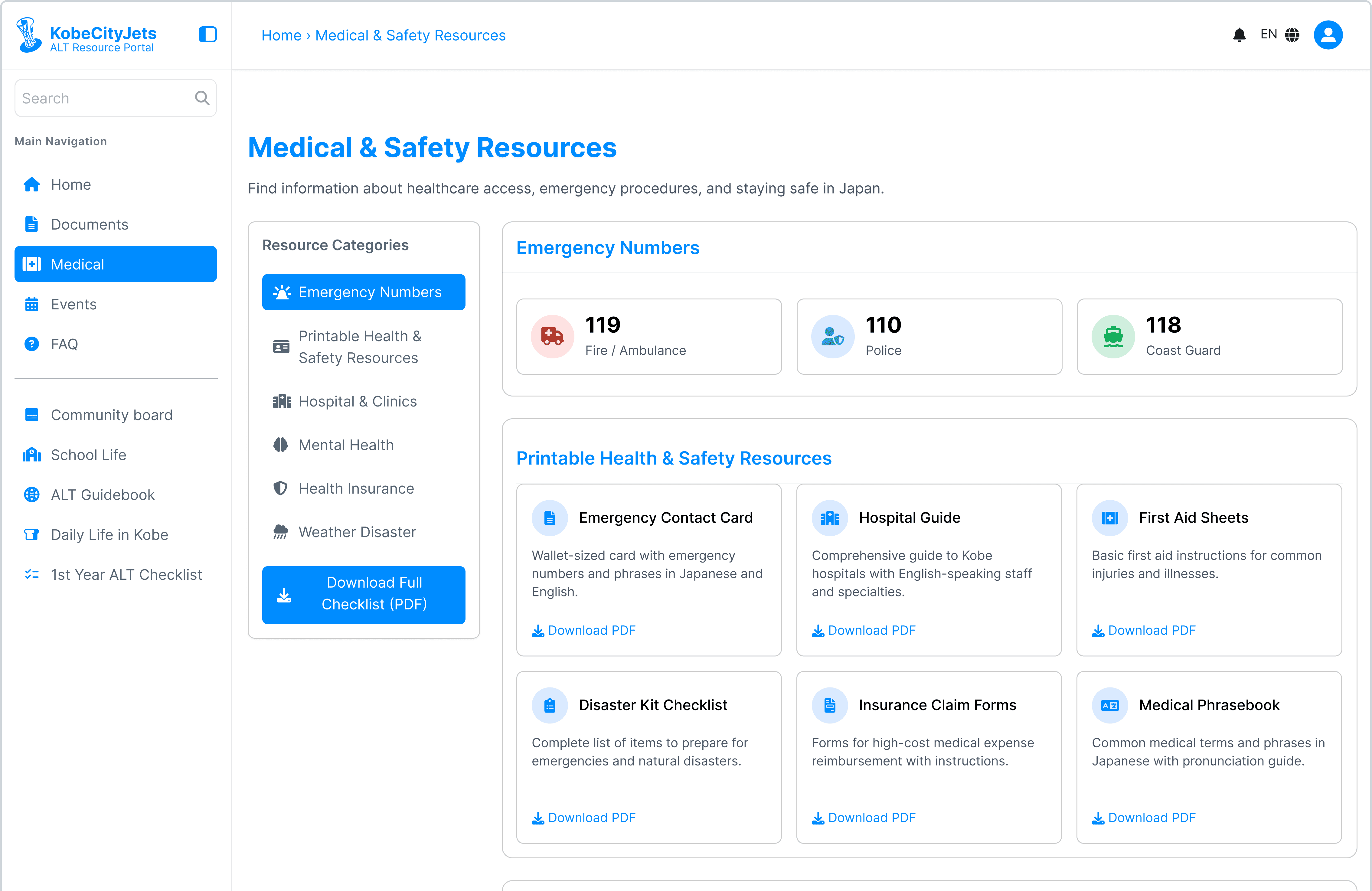 KobeCityJets is a centralized web platform designed to simplify how Assistant Language Teachers (ALTs) and Coordinators for International Relations (CIRs) access essential resources, forms, and city information in Kobe. This project aimed to streamline communication and reduce confusion caused by fragmented information systems.