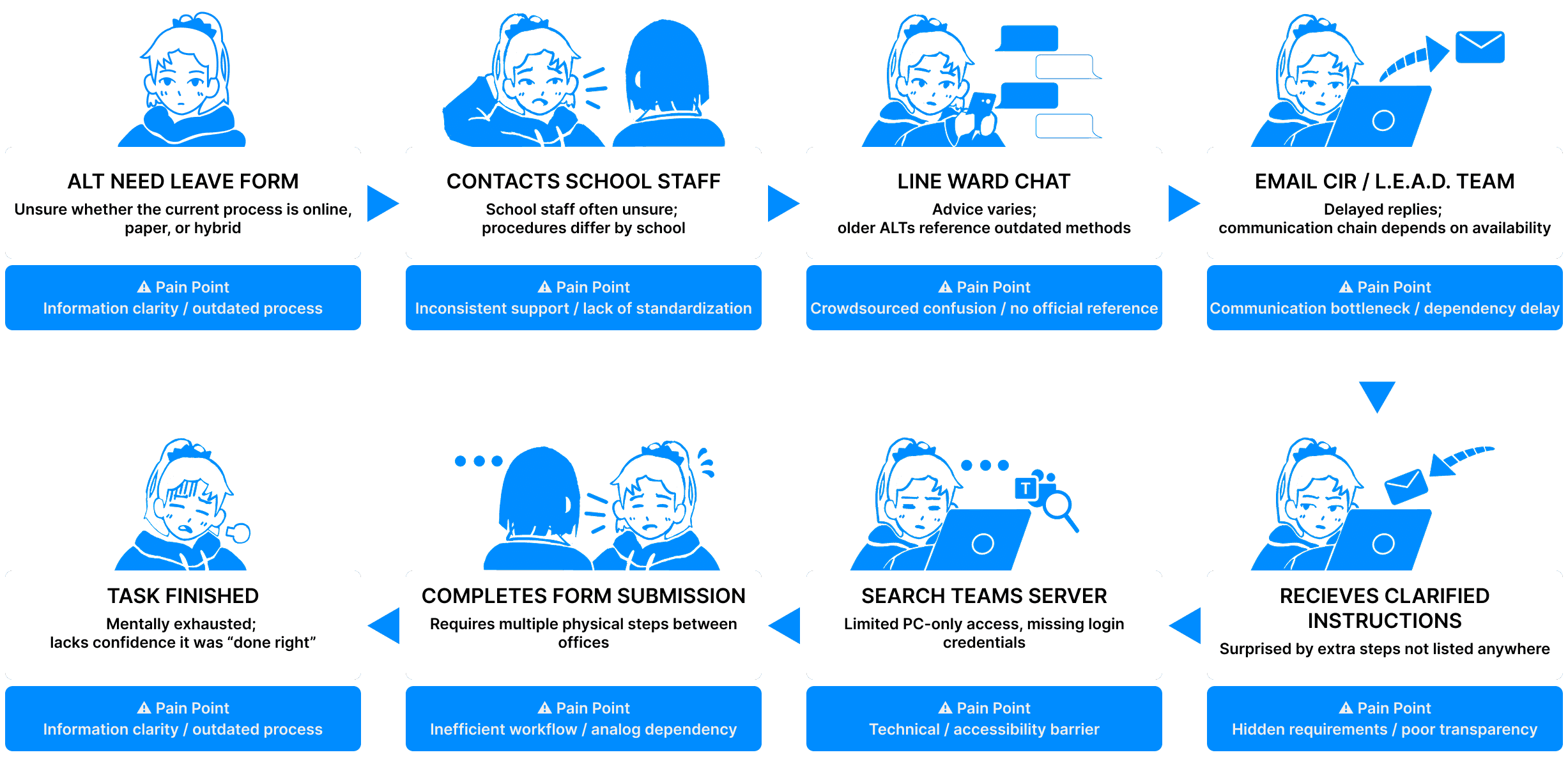 To highlight inefficiencies, I mapped a common scenario: an ALT requesting and submitting a leave form. The process exposed redundant steps, lack of status visibility, and reliance on outdated communication tools like fax and email.